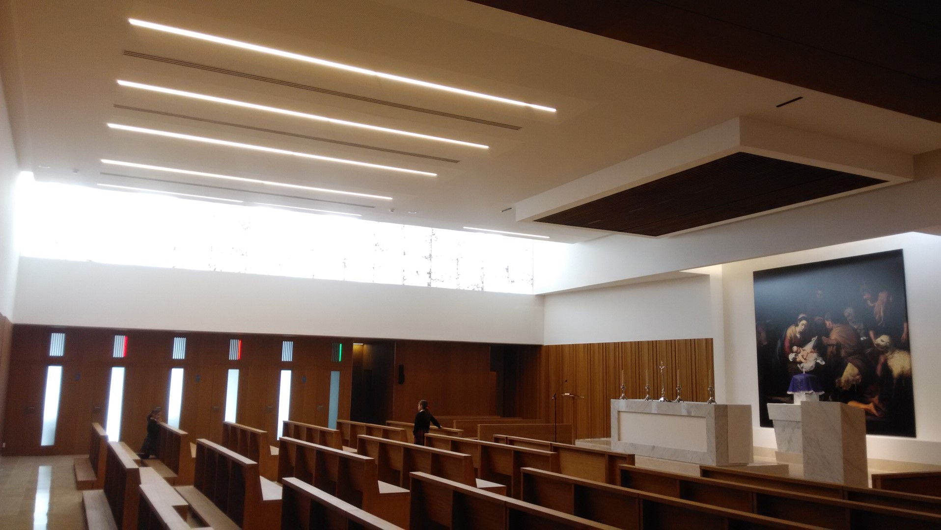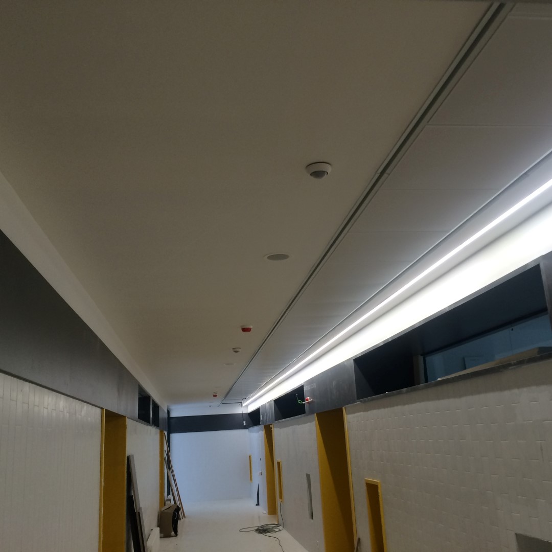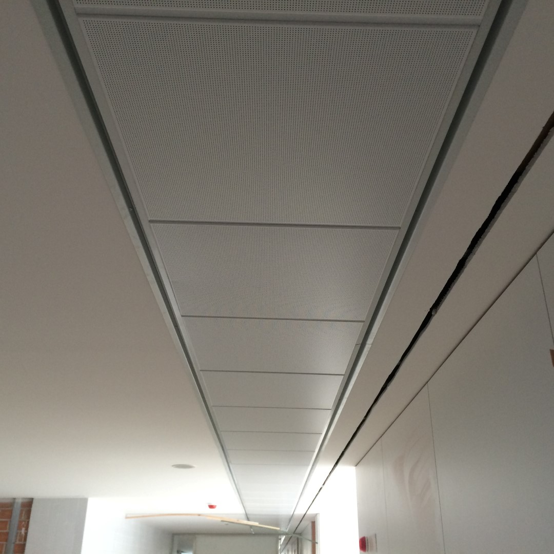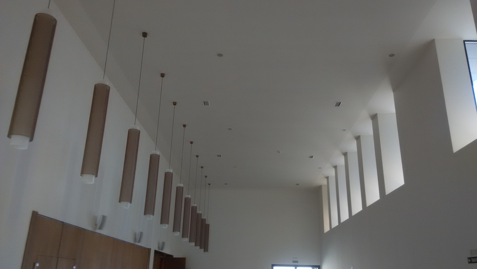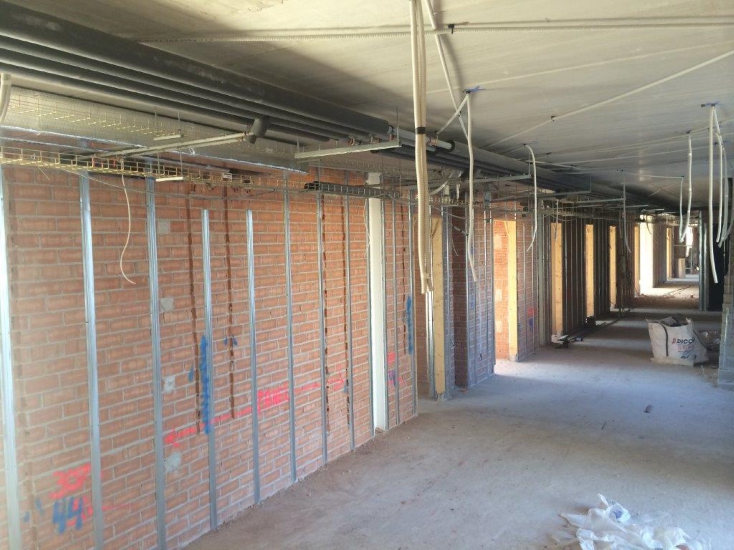 Construcción integral del Colegio Izaga en Pamplona. Trasdosados, tabiques, techos continuos, techos desmontables, techos acústicos, techos aquapanel y techos de lamas de madera.