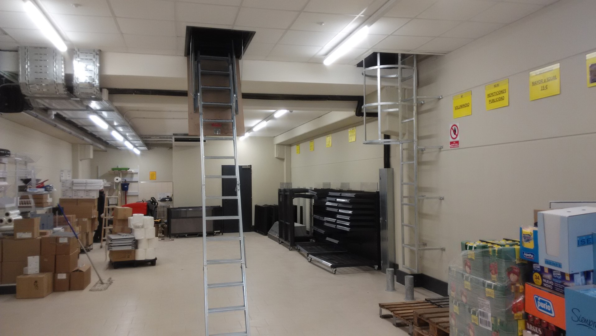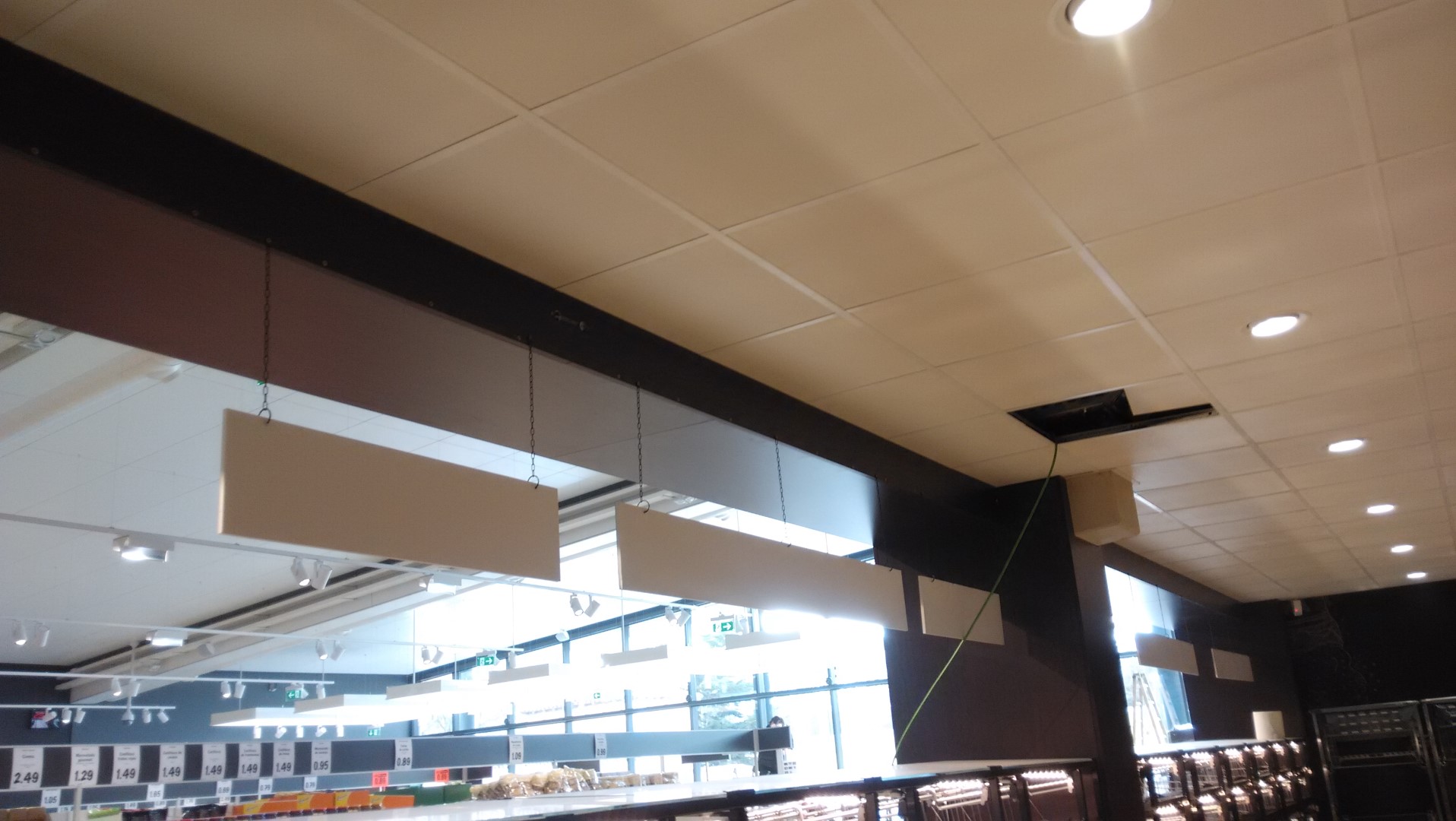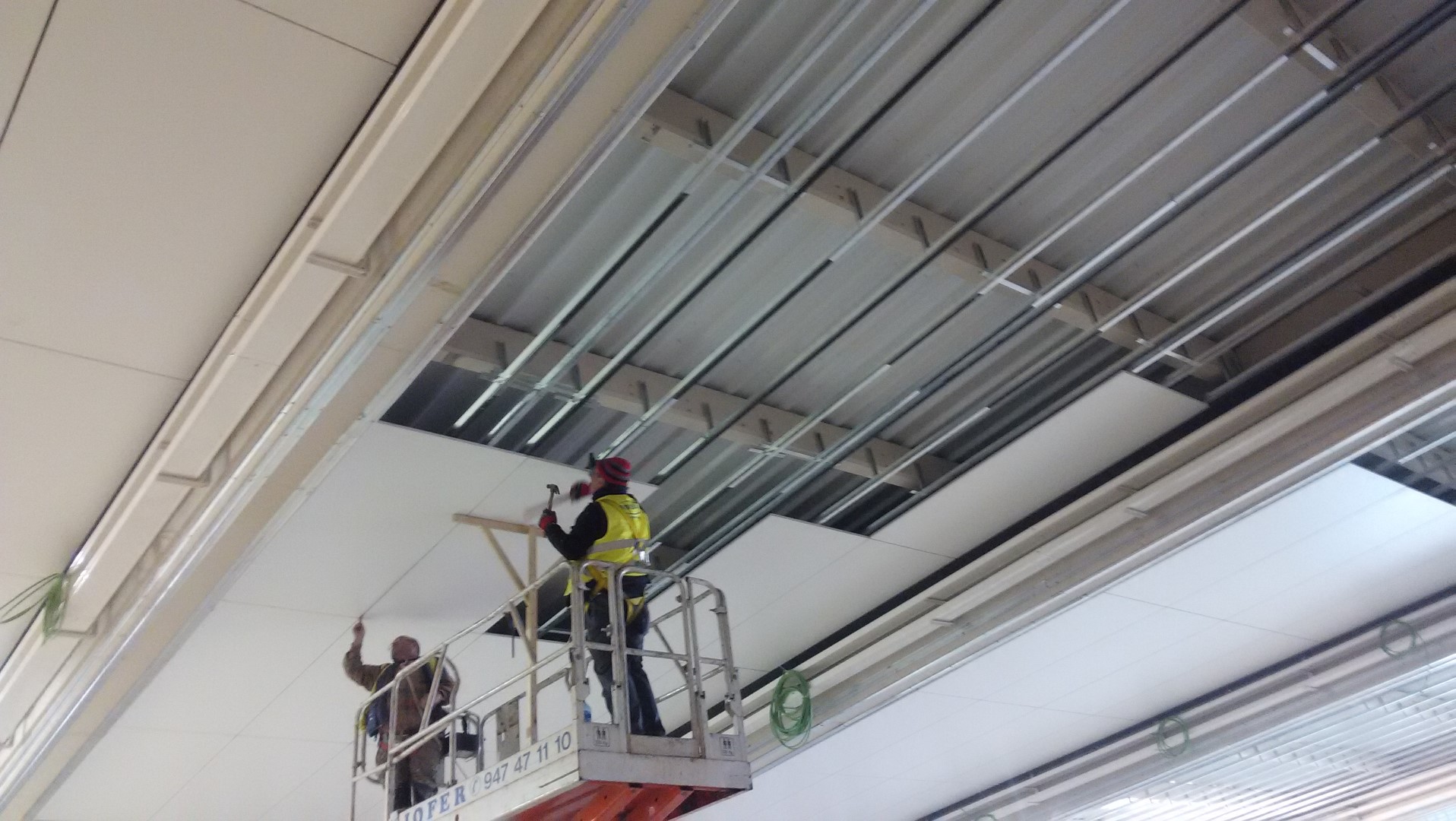 Construcción integral del supermercado Lidl en Burgos. Trasdosados, tabiques, techos continuos, techos desmontables, Finiplac y sectorizaciones EI.