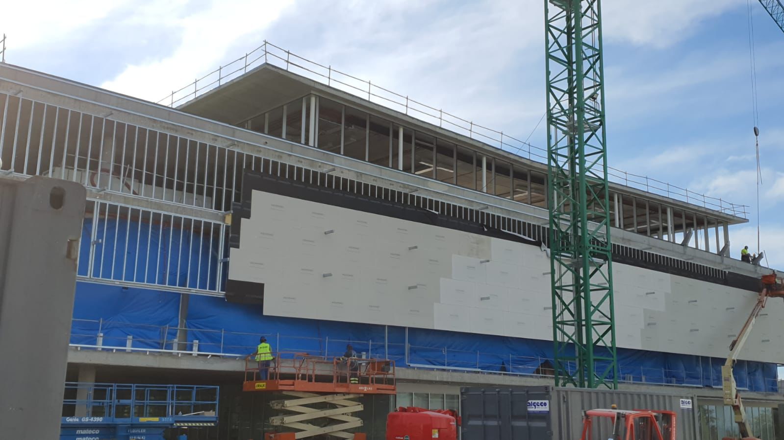 5750 M2 Montaje de Sistema de fachada WM311C.es compuesta por dos estructuras de acero galvanizado. Una estructura exterior, de acero galvanizado especial Z4, a la que se le atornilla por la cara exterior una placa de cemento Knauf AQUAPANEL® y otra estructura paralela de canales y montantes a la que se le atornillan dos placas de yeso por el interior. En todas las cámaras creadas llevará aislamiento. Incluso tratamiento superficial sobre la placa Aquapanel a base de Mortero superficial Aquapanel y malla superficial Aquapanel y acabado final de fachada formado por imprimación GRC y pintura lisa blanca flexible GRC Aquapanel.
